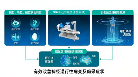 ADMS认知神经调控系统,通过视觉、听觉、触觉多种感官联合刺激,结合头部脑区光生物调节、极低频全身磁场刺激,能产生更广泛、更强烈的脑区伽马振荡诱导效果,覆盖海马、岛叶、杏仁核等更多痴呆症相关脑区,有效改善患者神经退行性病变及痴呆症状。