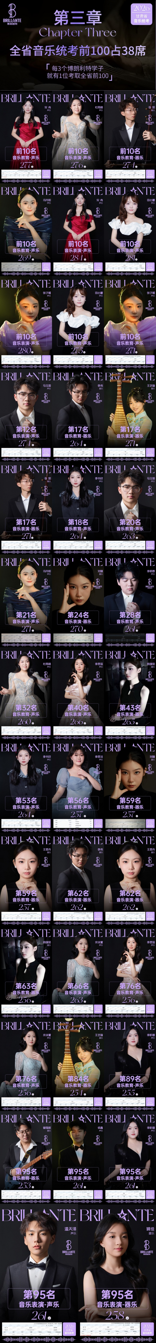 这是六年辉煌的最新高光。此前五年,7位综合冠军,我们被誉为“七星名校”;今年新增3席,正式迈入 “十星博利朗特”。连续六年,10位综合冠军——甘肃音乐艺考界,独此一家。